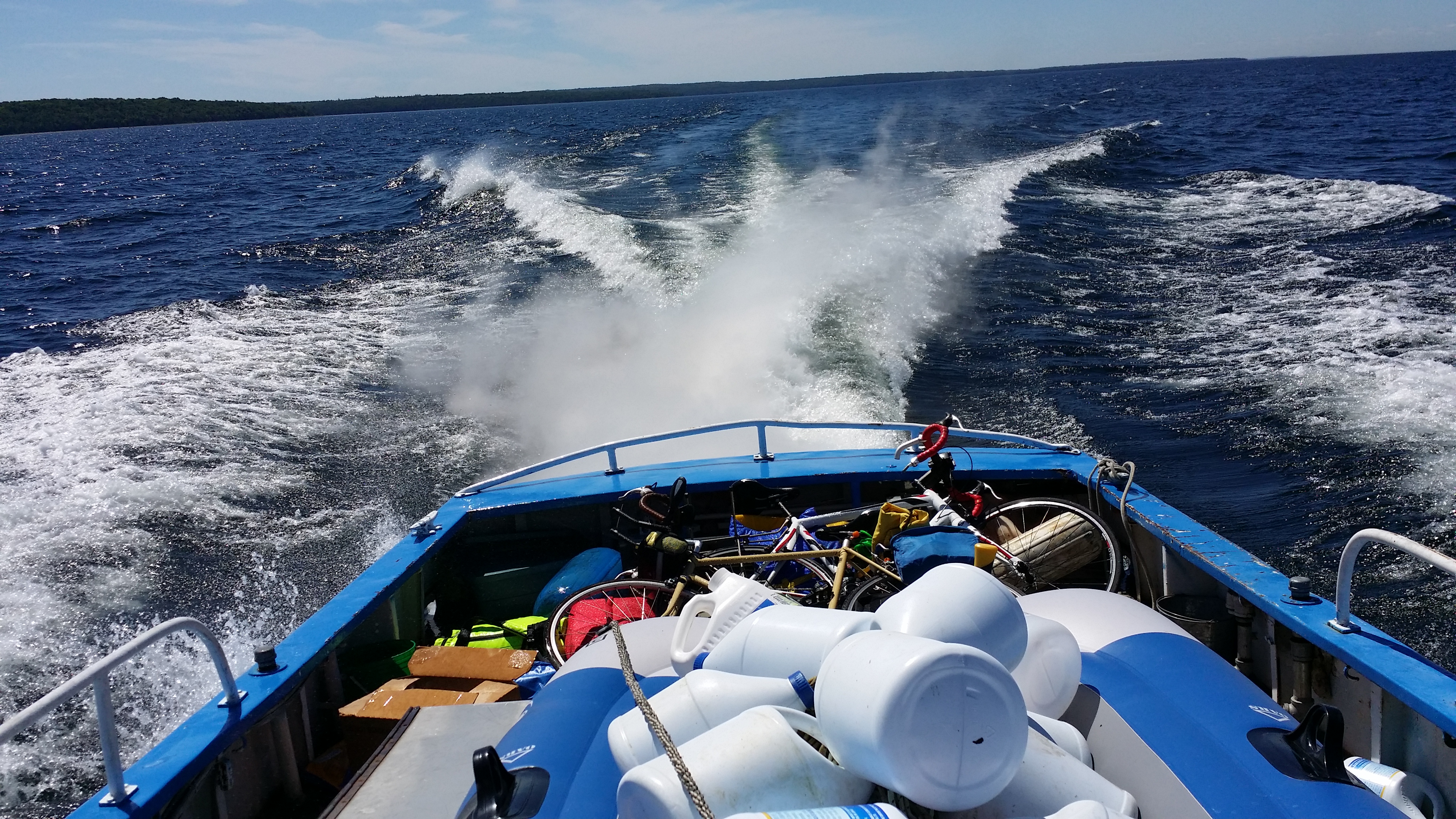 Out next step on the trip was to get to Cockburn (pronounced Co-burn) Island and paddle to Drummond Island, Michigan, USA. A very helpful man named Jim Noble carried us on his boat to the island and arranged for a ride to the west shore, where we were to start. (Jim couldn’t carry us to Drummond Island because of the international border and regulations governing crossings.) Skies were perfectly clear, and winds light. It seemed like perfect conditions. We had to ride on the tailgate of the truck, because our gear and bikes filled the back of the truck.
